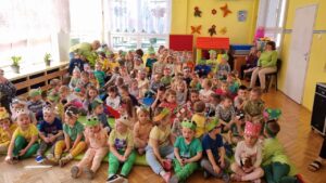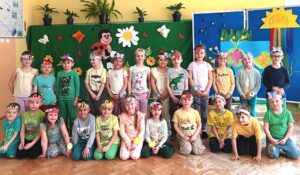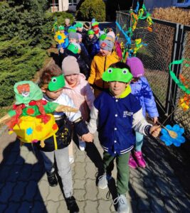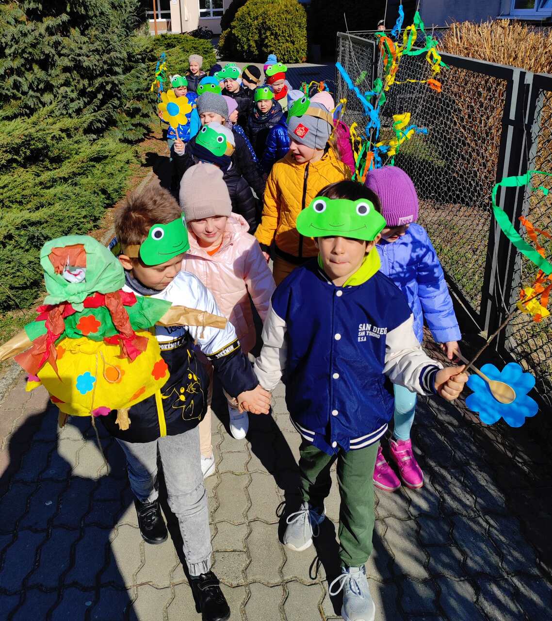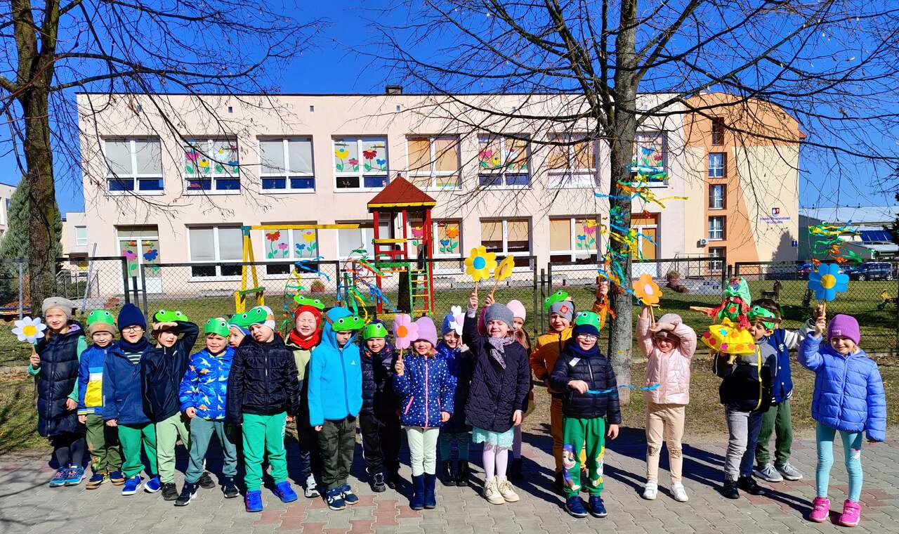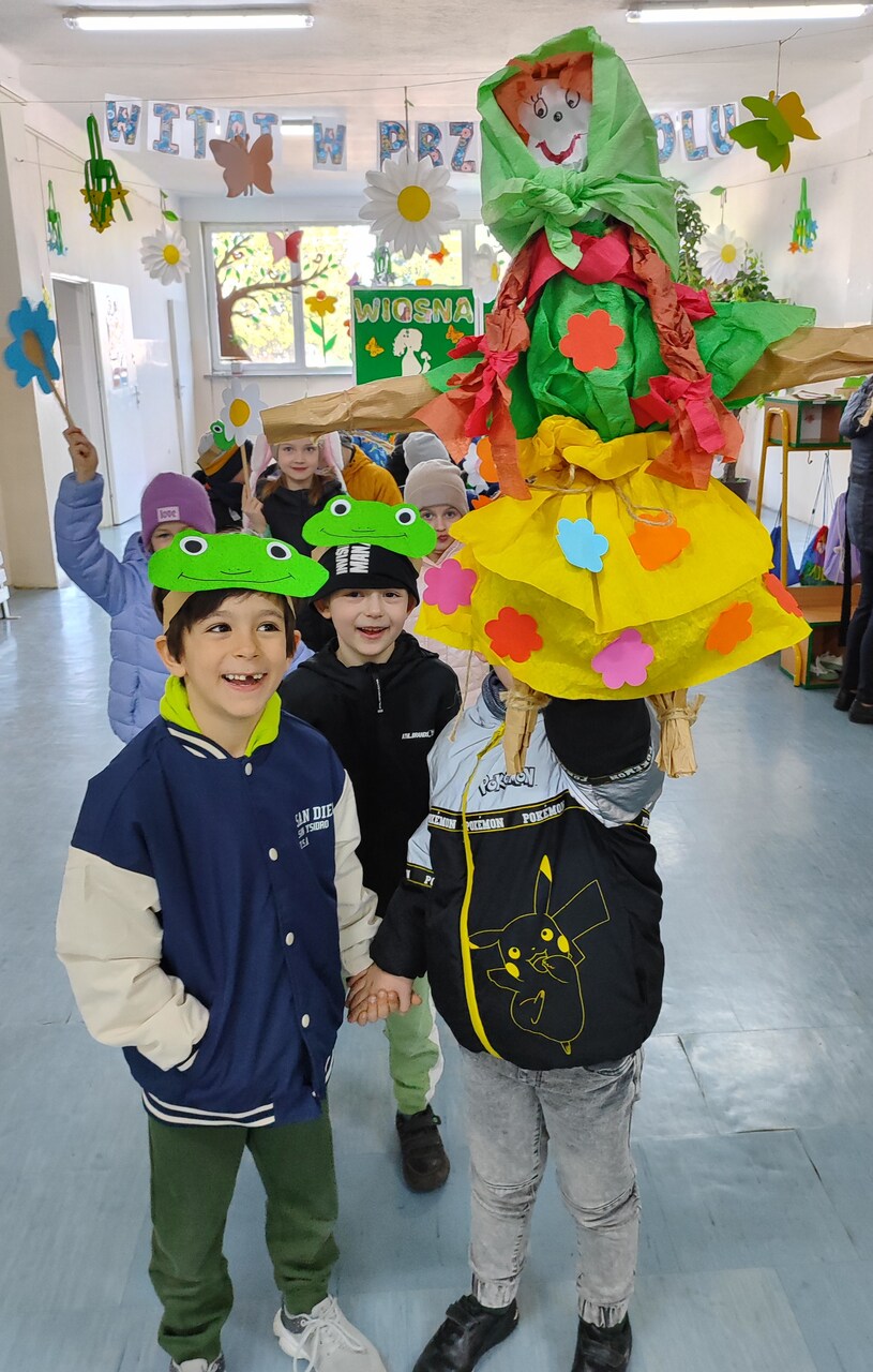 Jak co roku było bardzo wesoło i kolorowo. Aby podkreślić charakter tego dnia, wszyscy przyszli ubrani w wiosenne barwy. Od rana panowało wielkie poruszenie. Dekorowaliśmy sale, sialiśmy kwiatki, malowaliśmy kolorowe motyle, robiliśmy wiosenne opaski, były też zabawy, zagadki oraz konkursy. Jednak największą atrakcję stanowiło przedstawienie pt. „Powitanie Wiosny” przygotowane przez grupę Niebieską. Dzieci przebrane za ptaszki, żabki, kwiatki, słoneczko, Panią Wiosnę tańczyły, recytowały i śpiewały piosenki. Na koniec zaprosiły wszystkich na wiosenny spacer. Podczas przemarszu, na czele którego gościła Marzanna, przedszkolaki z grupy Różowej bacznie obserwowały piękno budzącej się do życia przyrody i głośnymi okrzykami przywoływały Panią Wiosnę. Był to niezapomniany dzień.