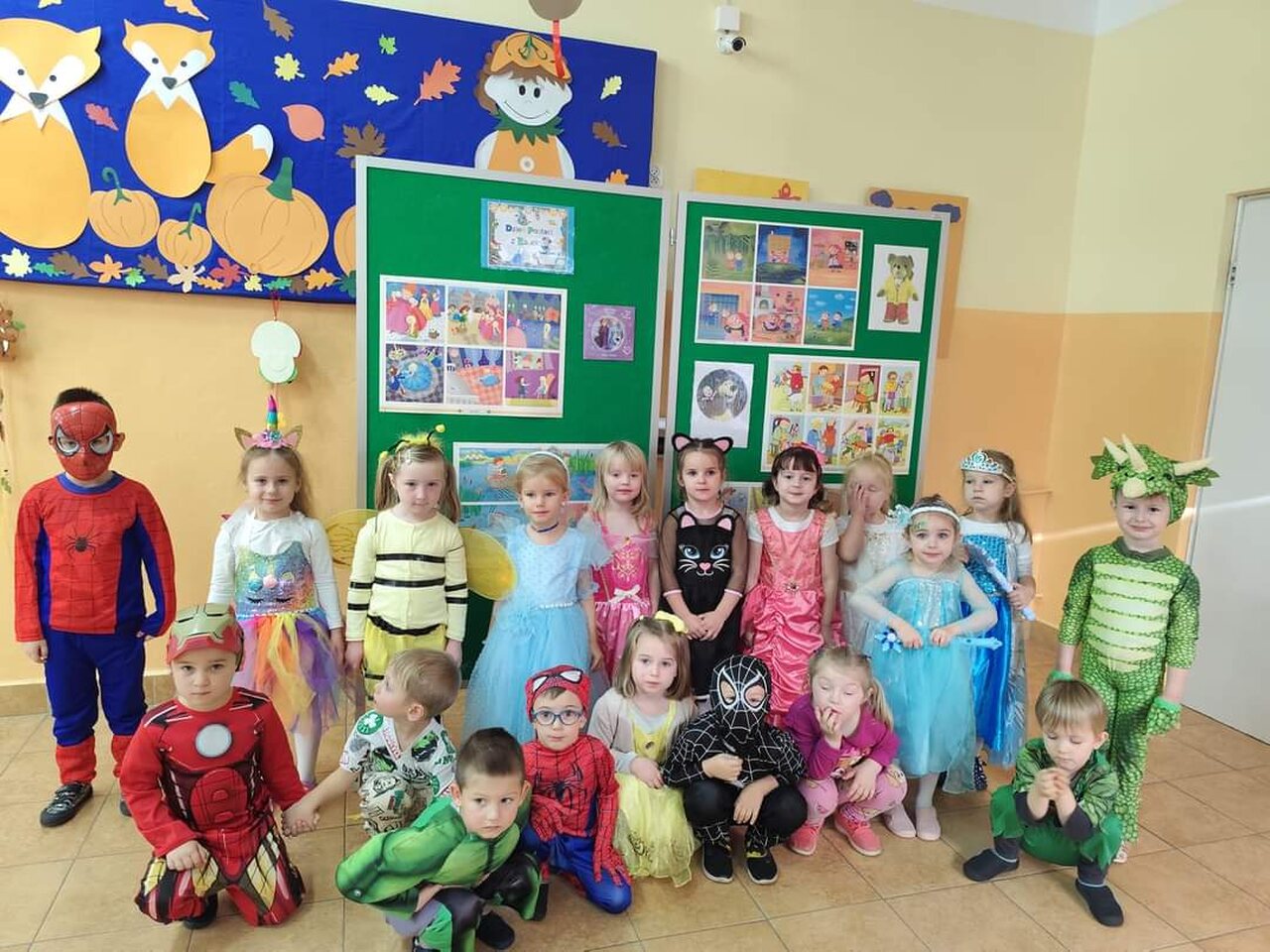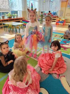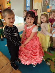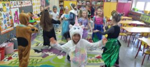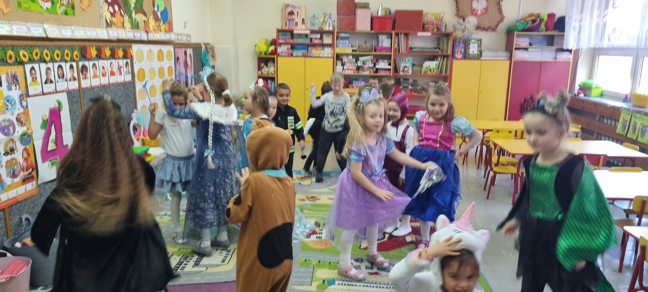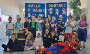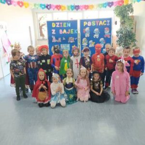 Dzieci w tym wyjątkowym dniu przybyły przebrane w przepiękne bajkowe stroje, które zaprezentowały podczas wspólnych tańców i zabaw. Nie zabrakło księżniczek, rycerzy, króla, Myszki Miki, Spider- Mana, Tygryska, Królewny Śnieżki, Czerwonego Kapturka i wielu innych bajkowych postaci. Tego dnia każda grupa brała udział w wielu zabawach i konkursach. Wysłuchały fragmentów najbardziej znanych baśni i bajek, rozpoznawały bajkowe postacie  i tytuły bajek, z których pochodzą. Wykonały również prace plastyczne związane z obchodzonym świętem. W nagrodę za czynny udział w obchodach Dnia postaci z bajek dzieci otrzymały dyplomy, medale i naklejki. Na koniec bajkowego, pełnego radości i dobrej zabawy dnia, wszystkie dzieci  z poszczególnych grup zrobiły sobie pamiątkowe zdjęcie na tle bajkowej dekoracji przygotowanej przez panie nauczycielki specjalnie na tę okazję. Był to dzień pełen wrażeń i radości.