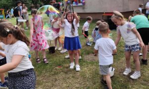 W ten piękny, słoneczny dzień przybyły do nas całe rodziny, na które czekała świetna zabawa. Piknik rozpoczął się prezentacją części artystycznej, przygotowaną przez wszystkie grupy. Przedszkolaki wierszami i piosenkami pokazały jak bardzo kochają swoich rodziców. To dla nich dzieci intensywnie ćwiczyły układy taneczne z pomponami i balonami, które uświetniły naszą uroczystość. Piękne upominki wręczane rodzicom były niespodzianką, przygotowaną przez najmłodszych. Po części artystycznej nadszedł czas na zabawę pod kierunkiem animatorów. Nic tak nie integruje, jak wspólna zabawa, dlatego zarówno rodzice jak i dzieci bardzo chętnie uczestniczyli w zawodach, konkursach i tańcach.