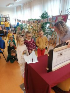 Przedszkolaki zwiedziły bibliotekę i poznały tajniki pracy pań bibliotekarek. Na koniec w związku ze zbliżającymi się Świętami Wielkanocnymi dzieci wykonały piękne koszyczki.