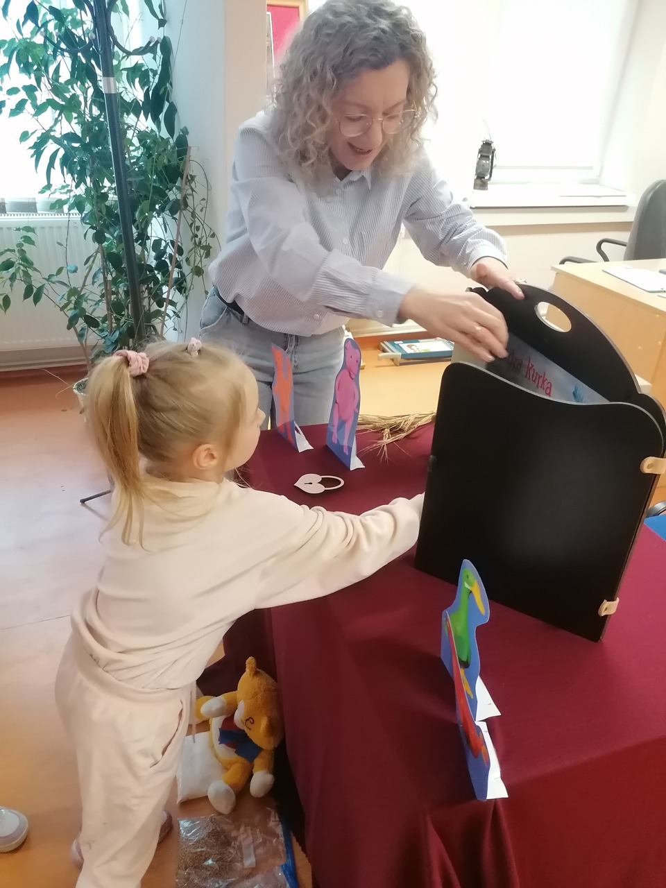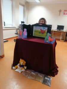 Mali czytelnicy z zaciekawieniem wysłuchali historii mądrej kurki, przedstawionej za pomocą teatrzyku Kamishibai. Bajka przypomniała jak ważna jest wzajemna pomoc i współpraca oraz to, że razem możemy osiągnąć o wiele więcej niż działając w pojedynkę.
