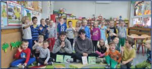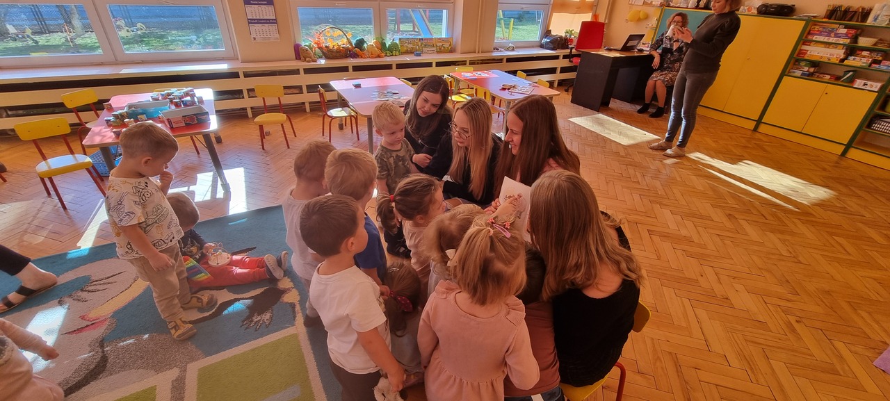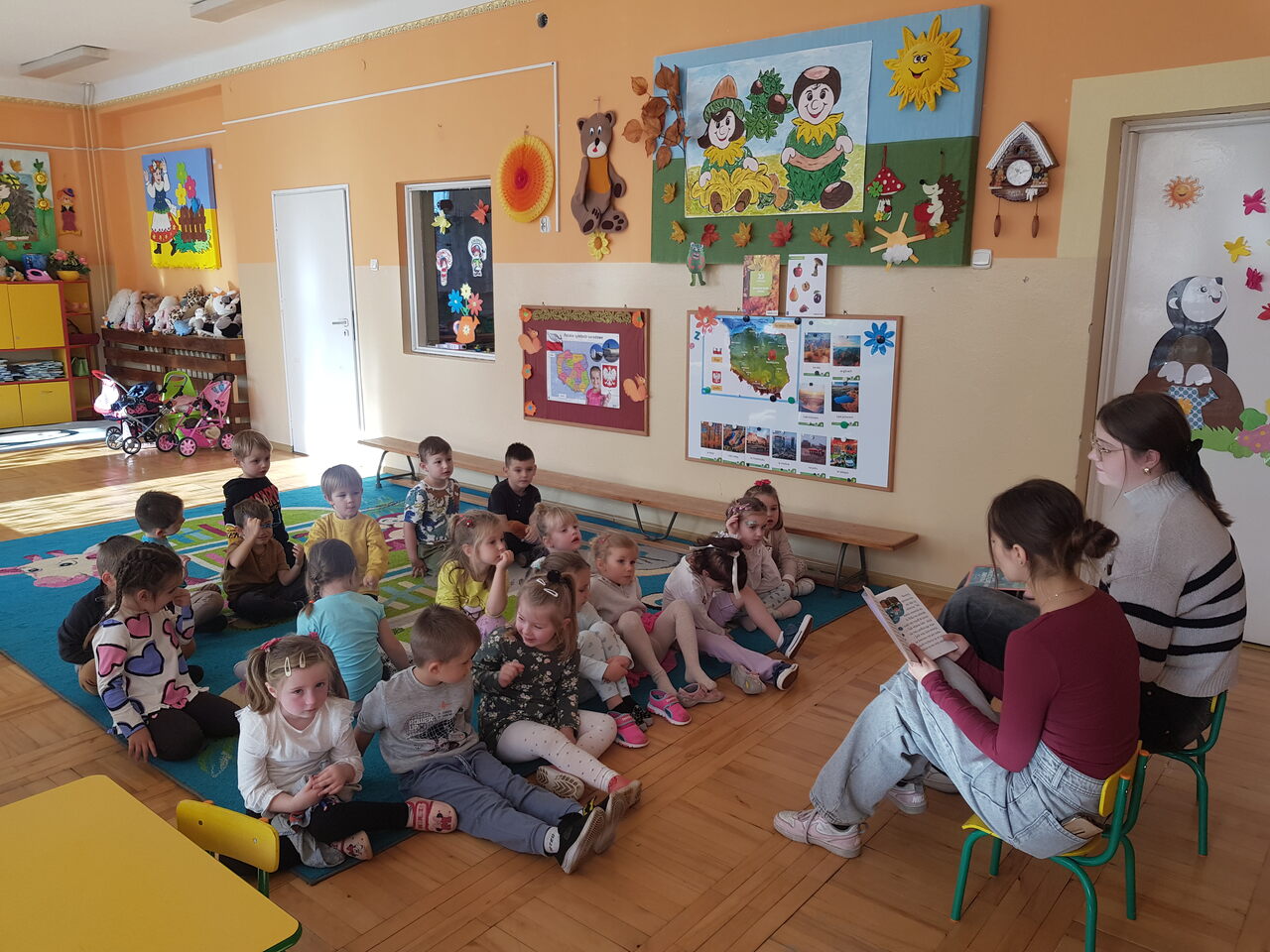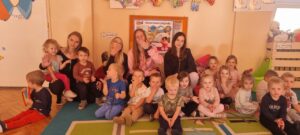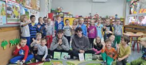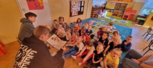 Starsi koledzy i koleżanki przybyli, aby czytać dzieciom ulubione bajki. Celem spotkania było propagowanie czytelnictwa wśród najmłodszych, które realizujemy w ramach programu czytelniczego „Baśnie, bajki, bajeczki”. Przedszkolaki od tych najmłodszych do najstarszych słuchały z wielkim zainteresowaniem, a później odpowiadały na pytania zadawane przez naszych gości. Były również tańce, piosenki, wspólna zabawa oraz pamiątkowe zdjęcia. Na koniec dzieci otrzymały kosz słodkości. Bardzo dziękujemy za miłe odwiedziny i zapraszamy ponownie.