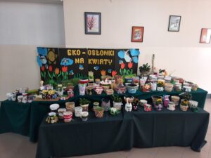 Z okazji Dnia Ziemi uczniowie klas I- III wraz ze swoimi wychowawcami przygotowali wystawę ,,Eko osłonki na kwiaty”.